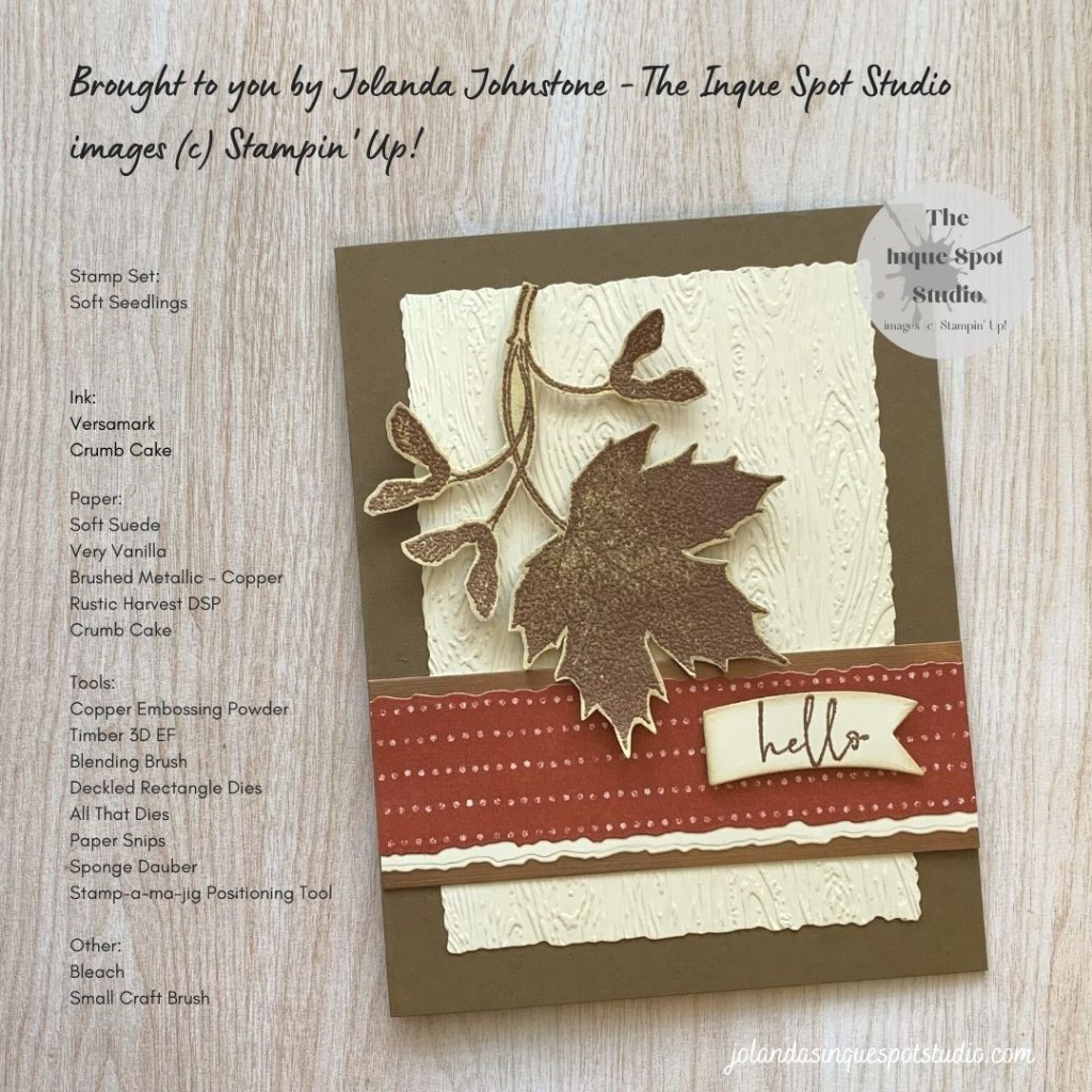 - The Fall Floral Maple Leaf and Seedlings image from the Soft Seedlings stamp set was stamped with Versamark ink and heat-set with Copper Embossing Powder.