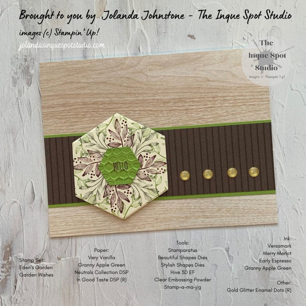 - The small hexagon from the Beautiful Shapes Sies set was die cut.The sentiment, HELLO, from the Garden Wishes stamp set was stamped into Veramark ink and then into Merry Merlot ink and heat-set with Clear Embossing Powder with the aid of the Stamp-a-ma-jig Positioning Tool.