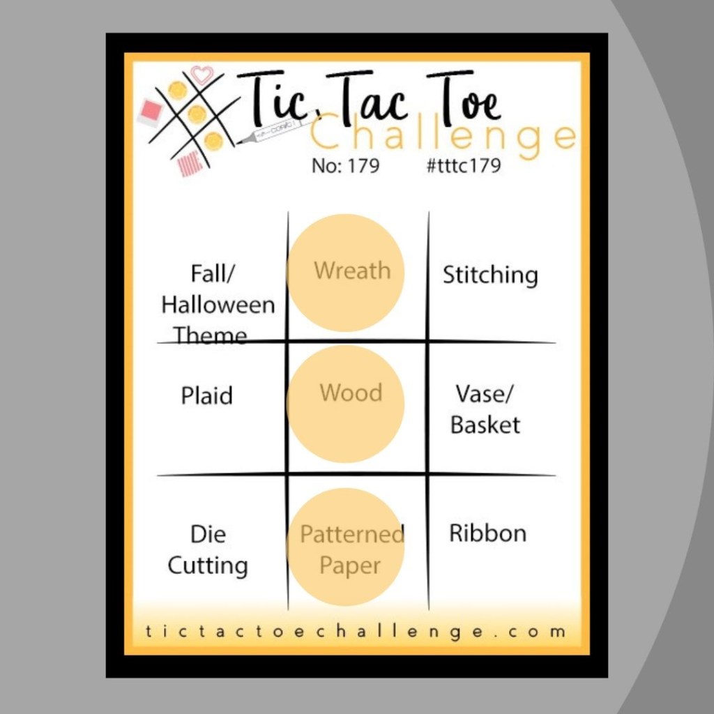 I am delighted to be invited to be a Guest with the Tic Tac Toe Team this week. I was given Challenge (#179) and I selected the Center Vertical Column: Wreath, Wood and Patterned Paper.