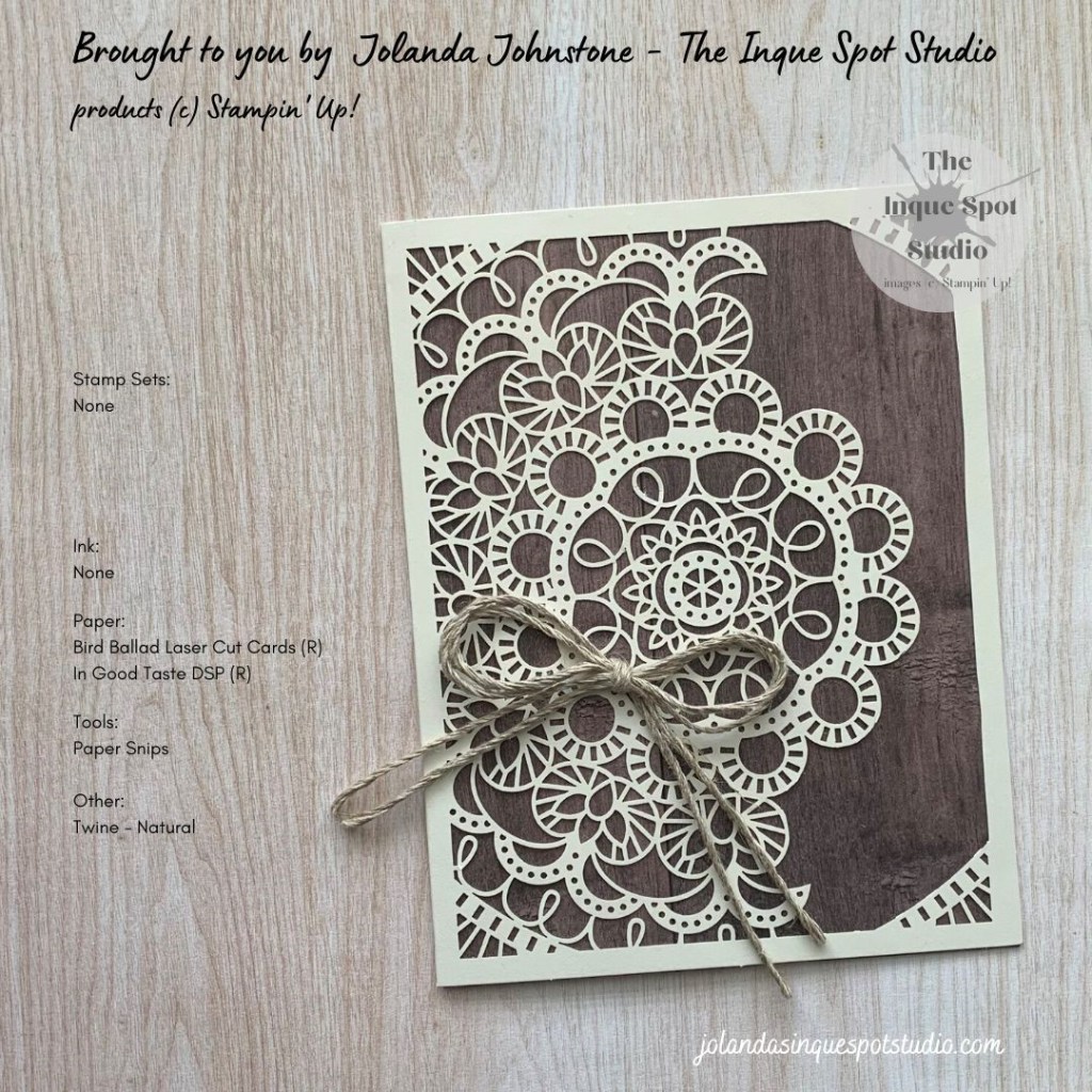 - Card Base: (8½” x 5½” scored at 4¼”) Very Vanilla retired Bird Ballad Laser Cut card.