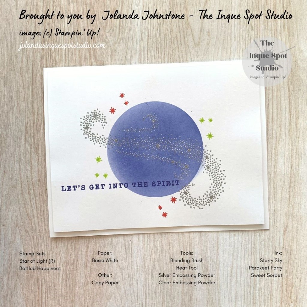 - The sentiment, Let’s get into the spirit, from the Bottled Happiness stamp set was also stamped using the Clear Color Embossing Technique with Starry Sky ink.