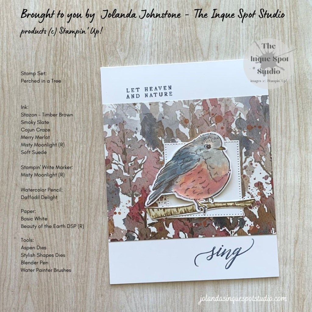 - The sentiment, Let Nature and Heaven Sing, from the Perched in a Tree stamp set was inked with the retired Misty Moonlight Stampin’ Write Marker. The sentiment was stamped split with “Sing” added to the bottom.