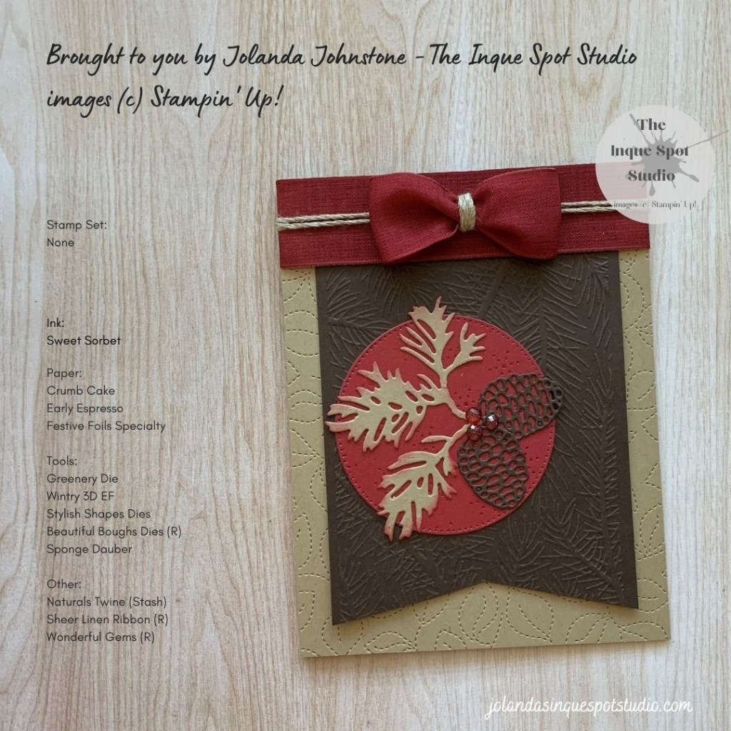 - The Banner was dry-embossed with the Pine Tree Branch patterned Wintry 3D Embossing Folder.