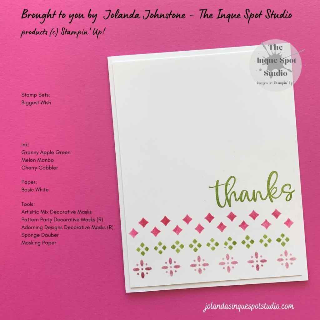 - Patterns from several Decorative Masks Collections were selected, layered, masked with Masking Paper, and colored with Sponge Daubers. Diamond: Melon Mambo ink with retired Pattern Party, Four Square: Granny Apple Green ink with retired Adorning Designs, and Floral: Cherry Cobbler ink with Artistic Mix.