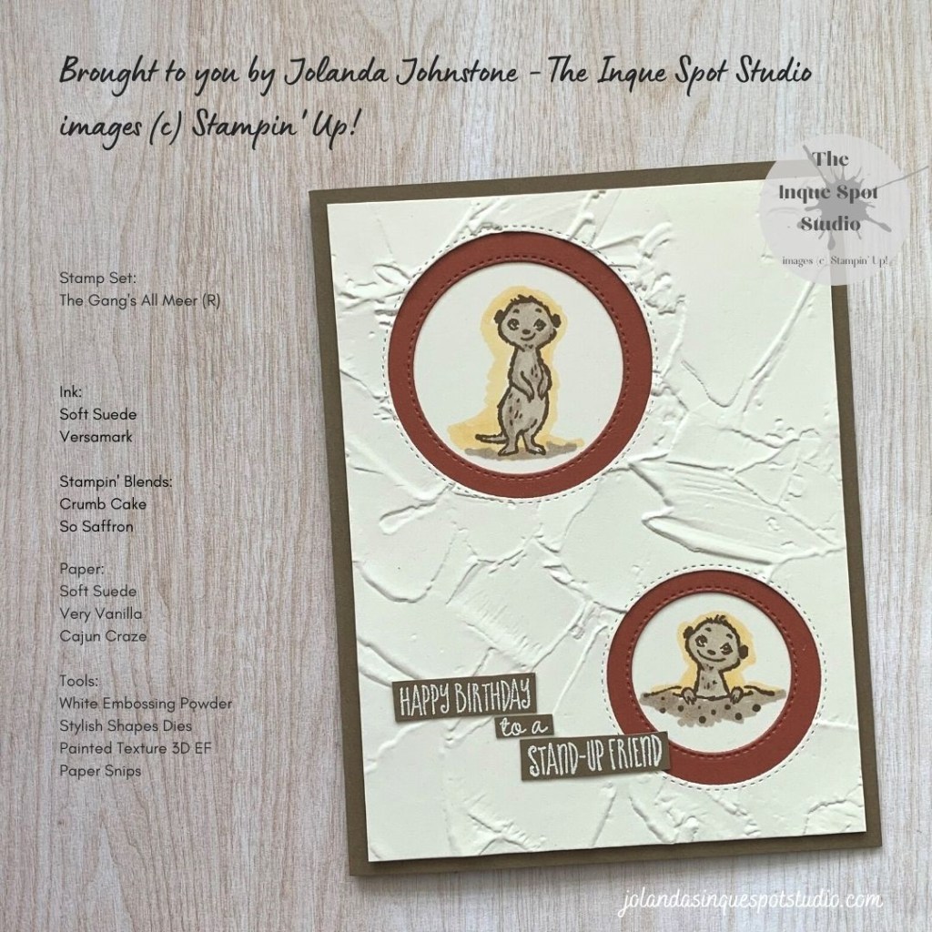 • Two of the Meercat images from the retired The Gang’s All Meer stamp set (Circa 2020) were stamped with Soft Suede ink.