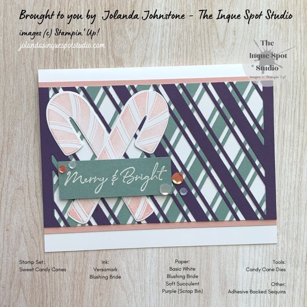 - The two Candy Cane images were stamped with Blushing Bride ink and die -cut with the coordinating Candy Cane Dies.