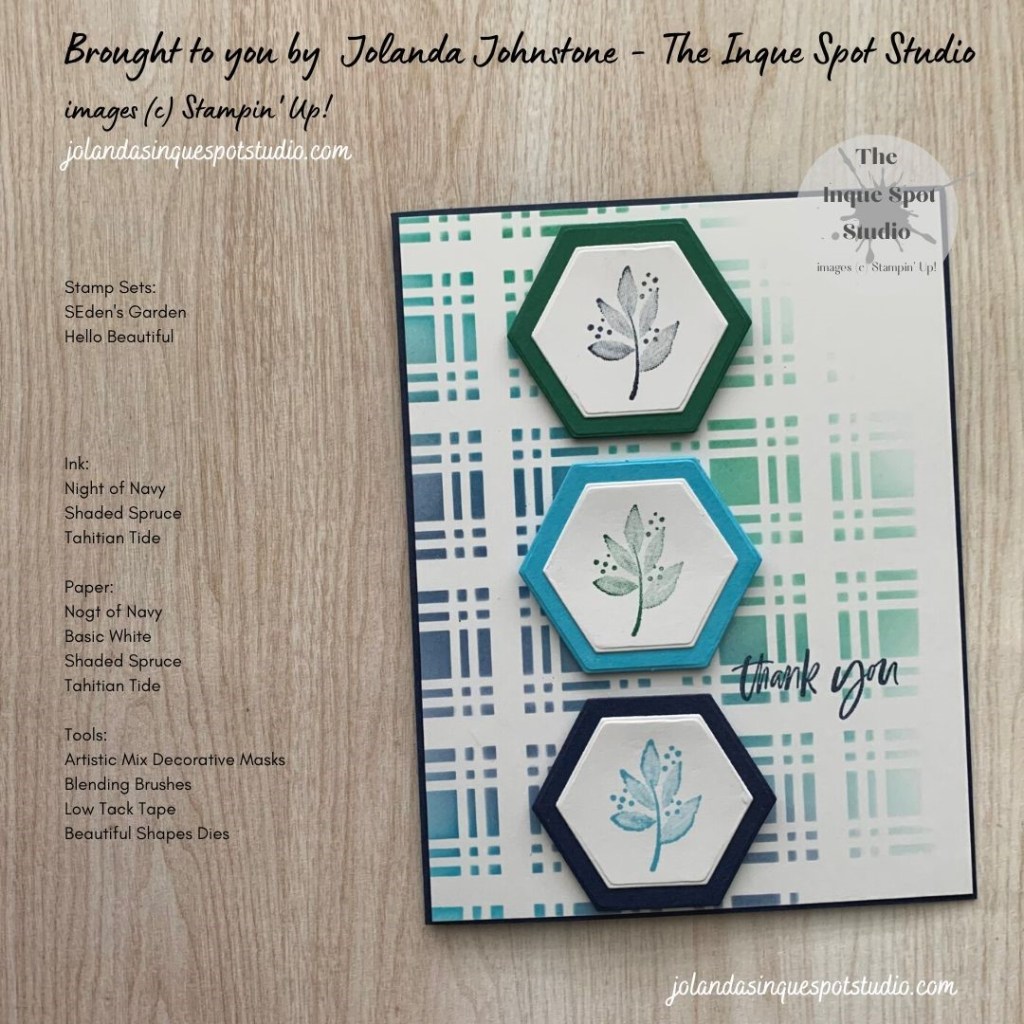 The Background Panel was adhered to the card base and the Small Leaf Hexagons were adhered to the Accent Mat Hexagons.  Night of Navy on Shaded Spruce, Shaded Spruce on Tahitian Tide and Tahitian Tide on Night of Navy. The Hexagons were popped up with Dimensionals and aligned in a row for a contemporary take on the Sketch.