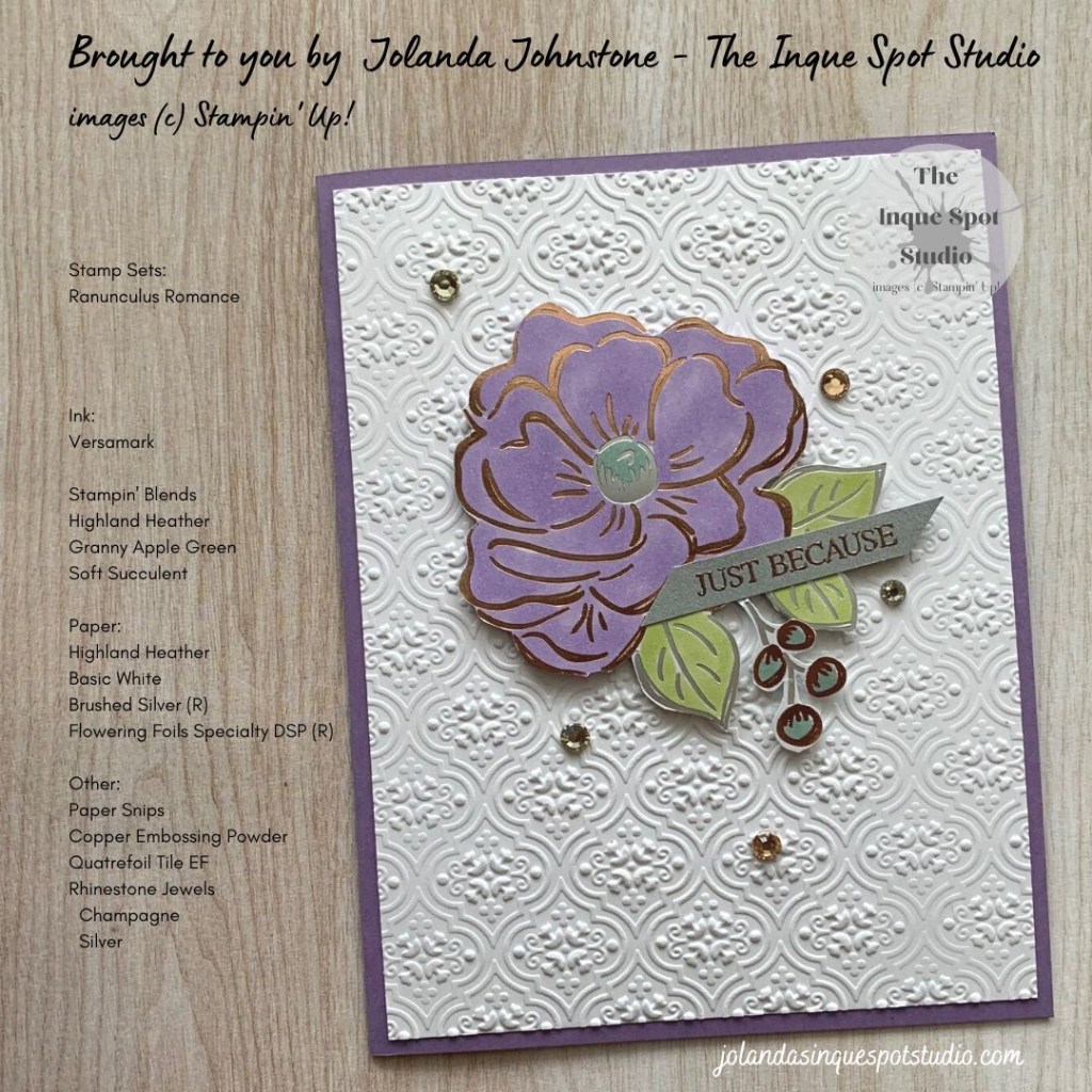 • The sentiment, Just Because, from the Ranunculus Romance stamp set was stamped with Versamark ink and heat-set with Copper Embossing Powder.