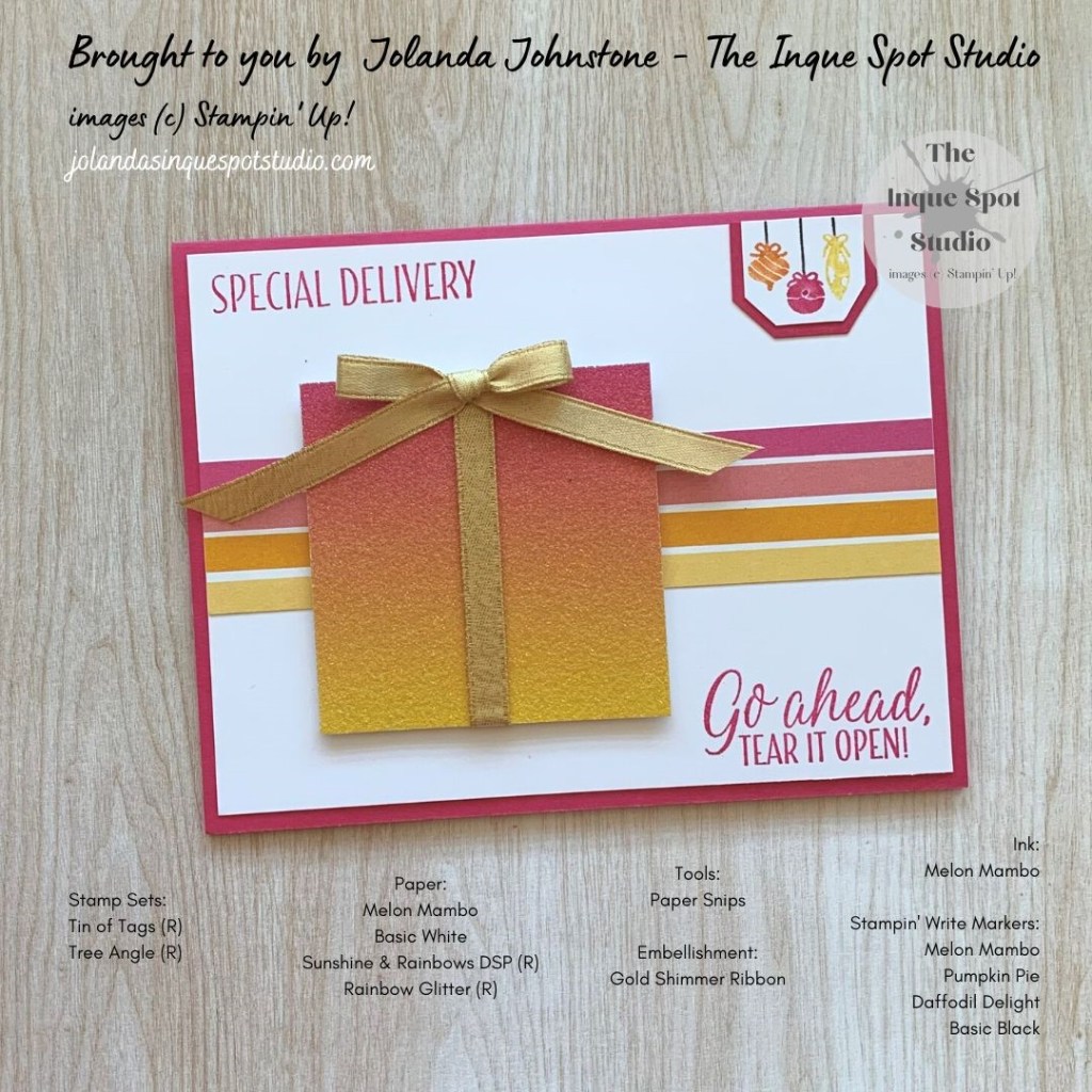 - The sentiments, Special Delivery and Go Ahead, Tear it Open!, from the retired Tin of Tags stamp set were stamped in the top left and bottom right corners with Melon Mambo ink.