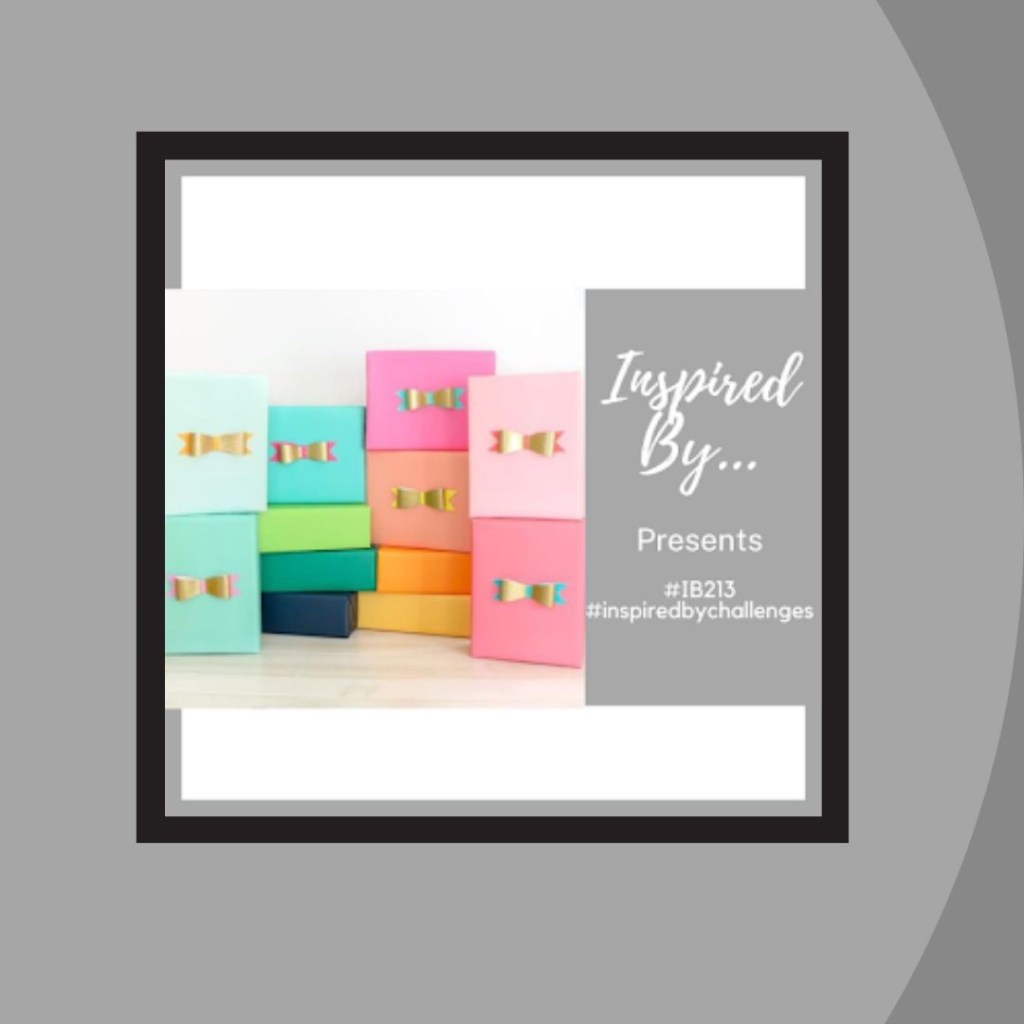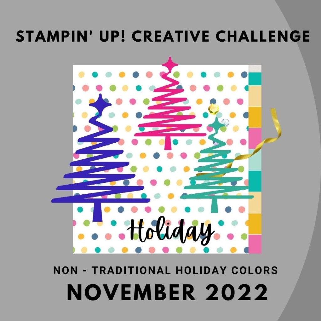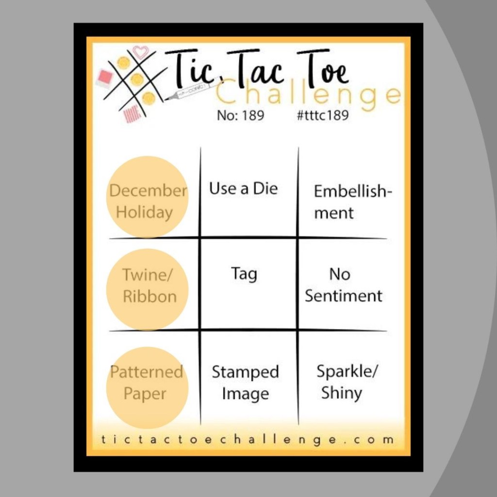 Let’s check the boxes: #SimpleStamping – just stamps, ink and paper plus a ribbon embellishment; #CreativeChallenge – Non-traditional holiday colors; Inspired By – Gift Box with Bow; Tic Tac Toe – December holiday (Christmas), ribbon and patterned paper. However, a few other rows are covered off as well – Patterned paper, tag, and embellishment; December holiday, tag and sparkle; along with Patterned paper, stamped image and sparkle; and Just Add Ink – a square and a centered horizontal element.