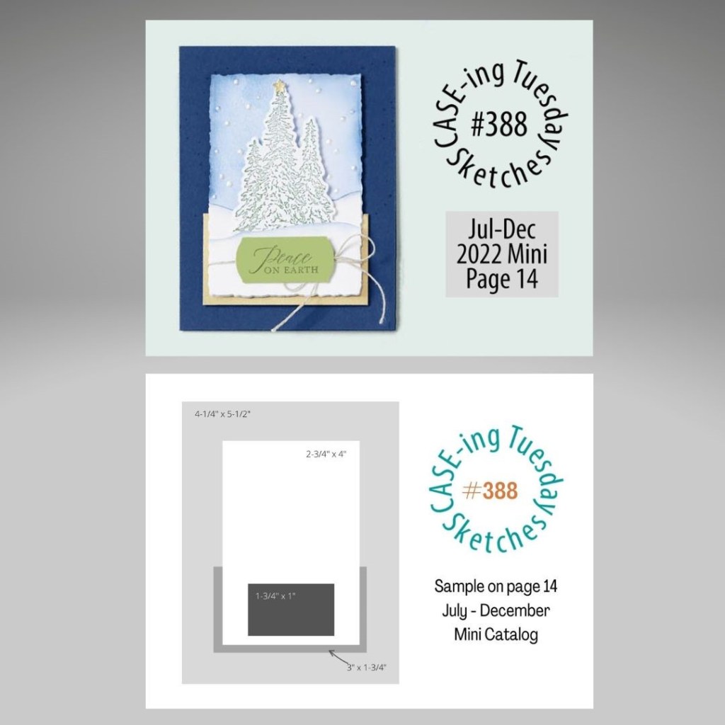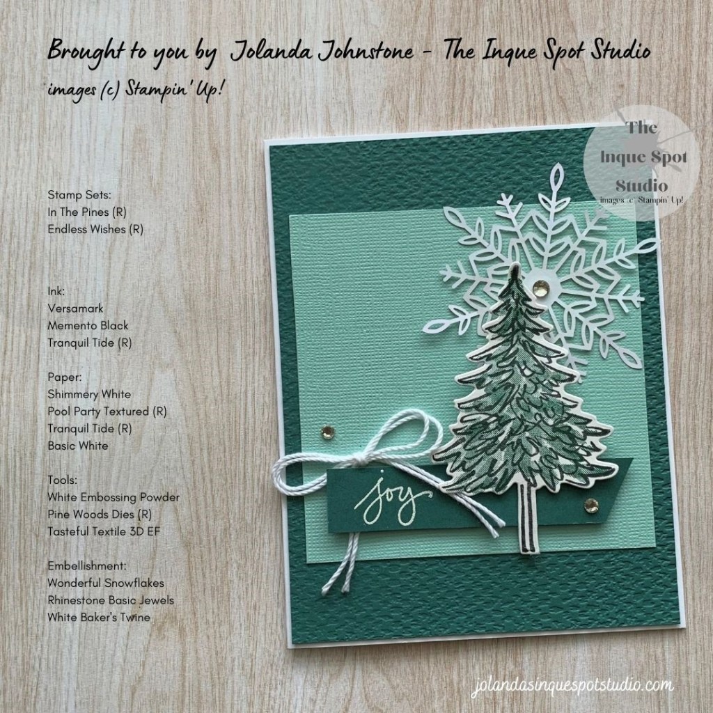 - Focal Image – Pine Tree: (2½” x 3½”) Shimmery White cardstock. The Pine Tree outline and fill-in Foliage two-step stamps were selected from the retired In the Pines stamp set. The outline Pine Tree was stamped with Memento Tuxedo Black ink and the fill-in Foliage was stamped with retired Tranquil Tide ink. The Tree was then die-cut with the coordinating Tree die from the Pine Woods Dies set.