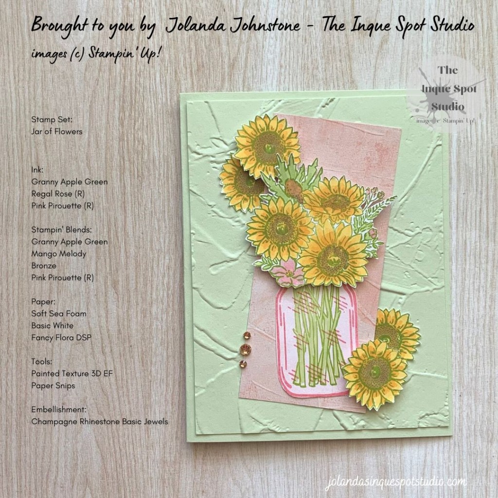 - The Sunflower Floral Arrangement image was stamped with Granny Apple Green ink and colored with Stampin’ Blends Markers. Colors: Light and Dark Mango Melody, Pink Pirouette Dark, Flirty Flamingo Light, Granny Apple Green Light and Bronze.