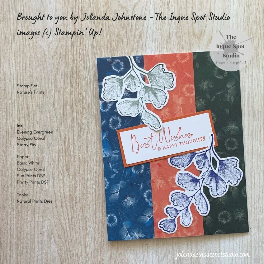 • The sentiment, Best Wishes & Happy Thoughts, from the Nature’s Prints stamp set was stamped with Calypso Coral ink.
