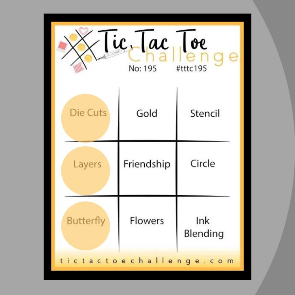 Tic Tac Toe (#195) for the Butterfly, TGIF (#406) for the Color, Paper Players (#626) for the Music and Sunday Stamps (#302) for the Sketch.