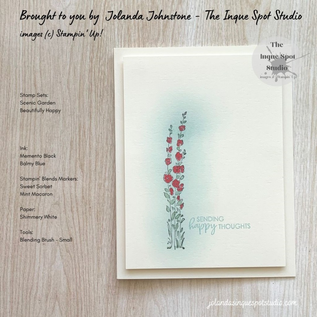 • The sentiment, Sending Happy Thoughts, from the Beautifully Happy stamp set was added with Balmy Blue ink.