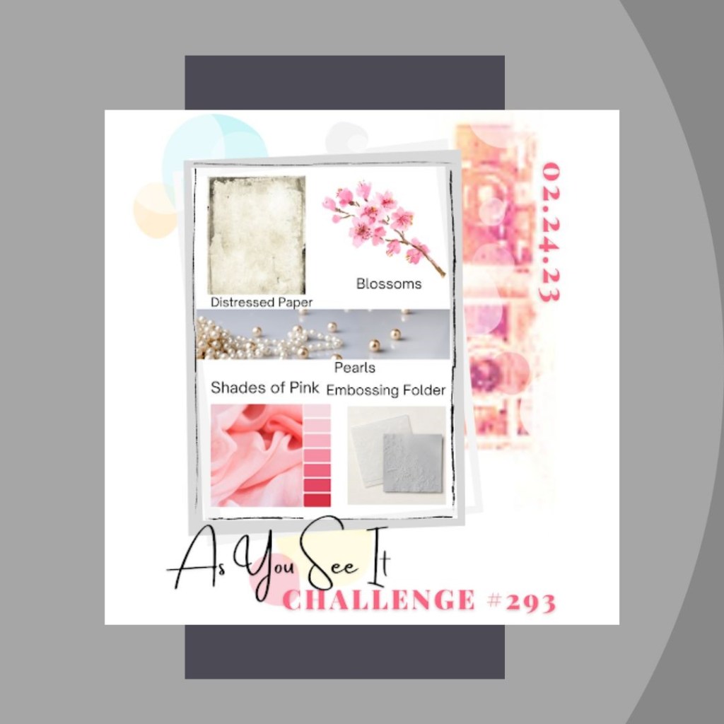 Challenge Check: Distressed Paper, Blossoms, Pearls, Color Pink, Embossing…Tag…X’s & O’s…I think they are all accounted for!