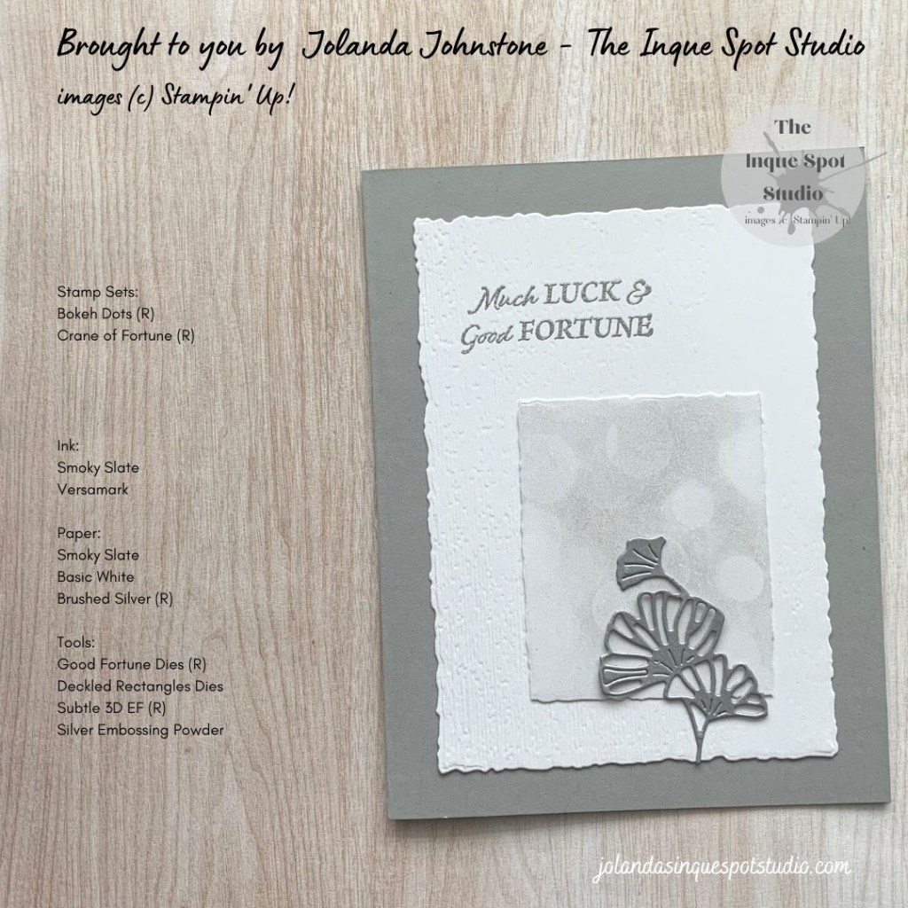 - The sentiment, Much Luck & Good Fortune, from the retired Crane of Fortune stamp set was stamped with Versamark ink and heat-set with Silver Embossing Powder.