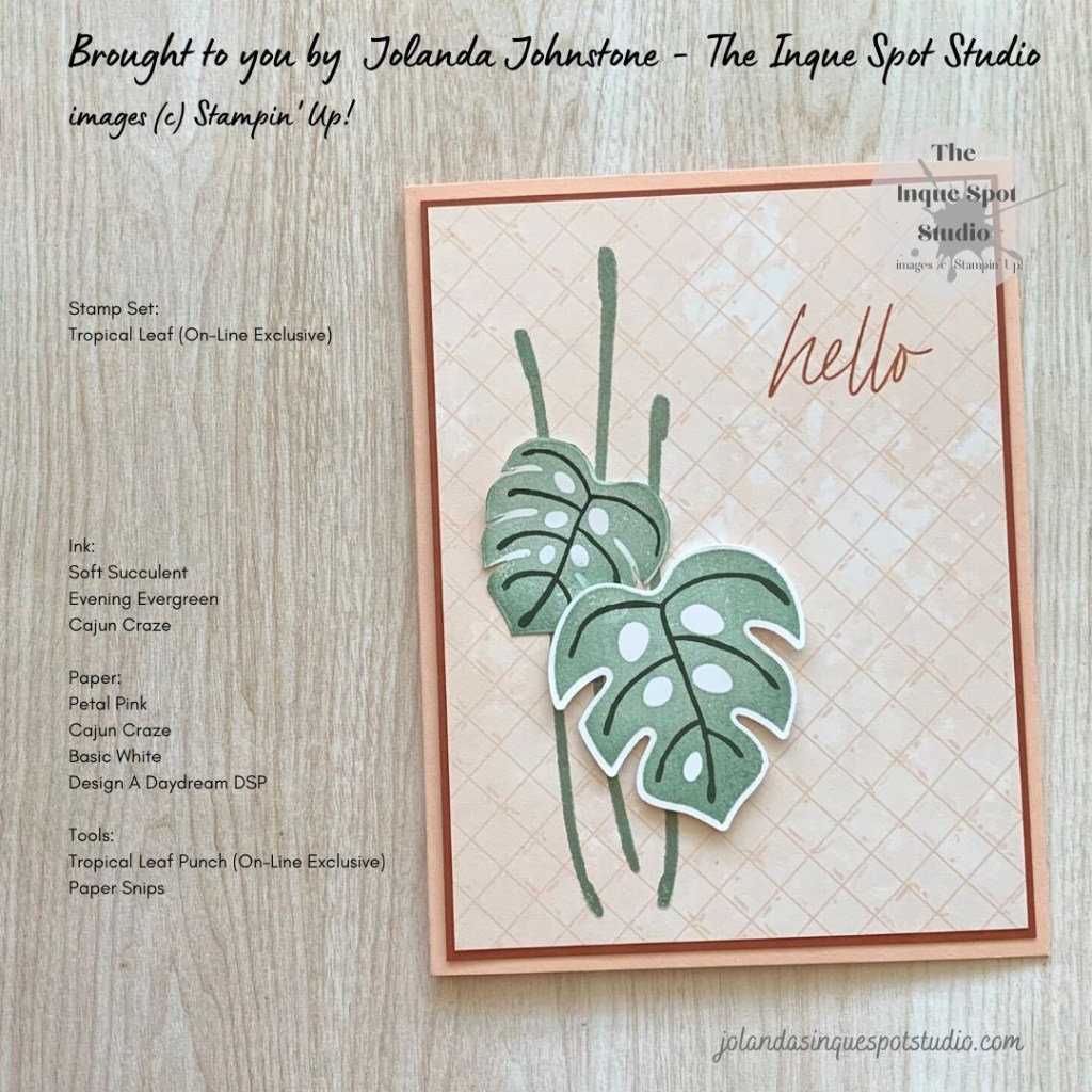 Every month, Stampin’ Up! presents a #SimpleStamping challenge.  Simple Stamping = Just Stamps, Ink and Paper.  The challenges sometimes include a few other parameters.  For this month, use a punch and the sentiment, Hello.  I chose to use the new Tropical Leaf Bundle available as an On-Line Exclusive.