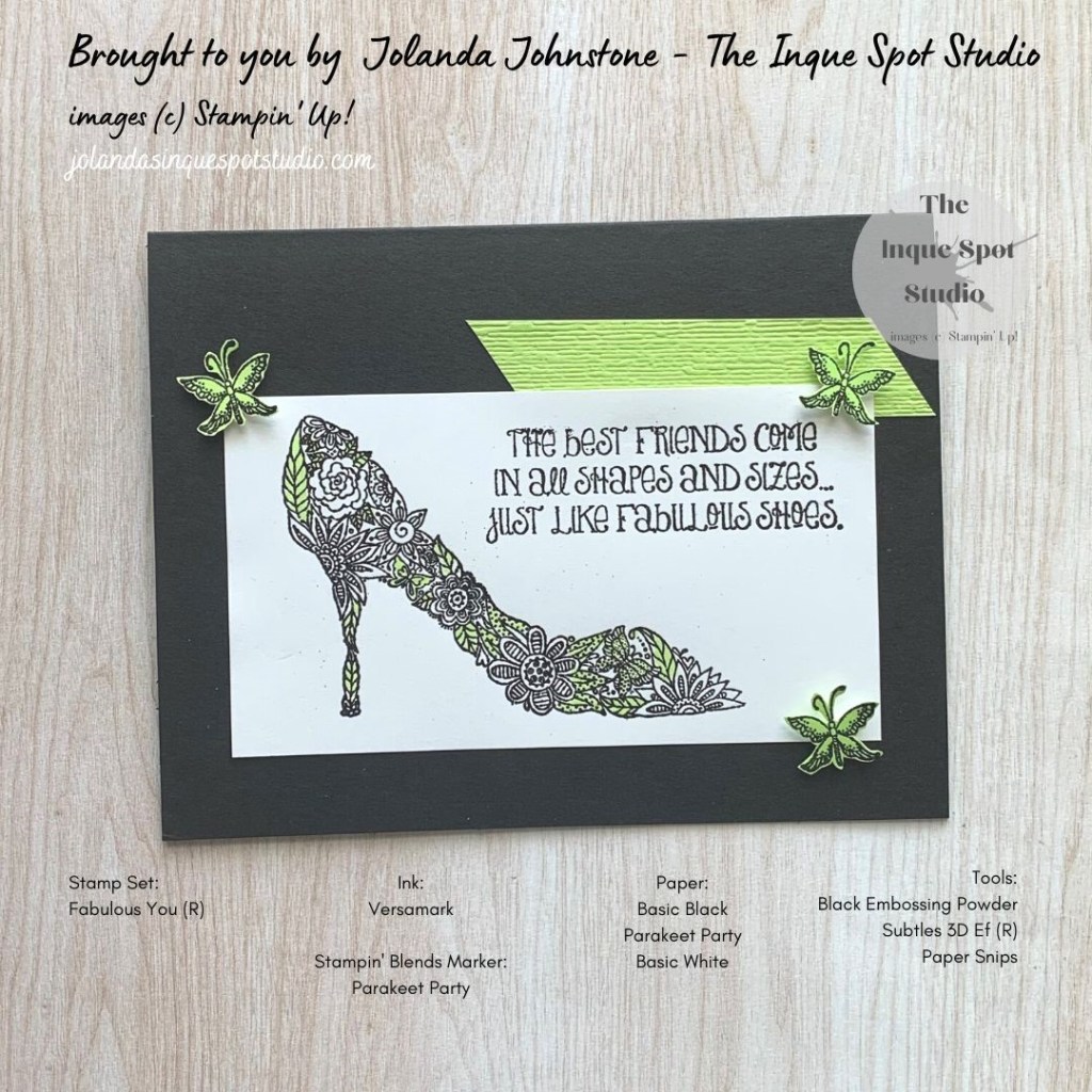 - Both the Floral Shoe and Sentiment from the retired Fabulous You stamp set was stamped with Versamark ink and heat-set with Black Embossing Powder.