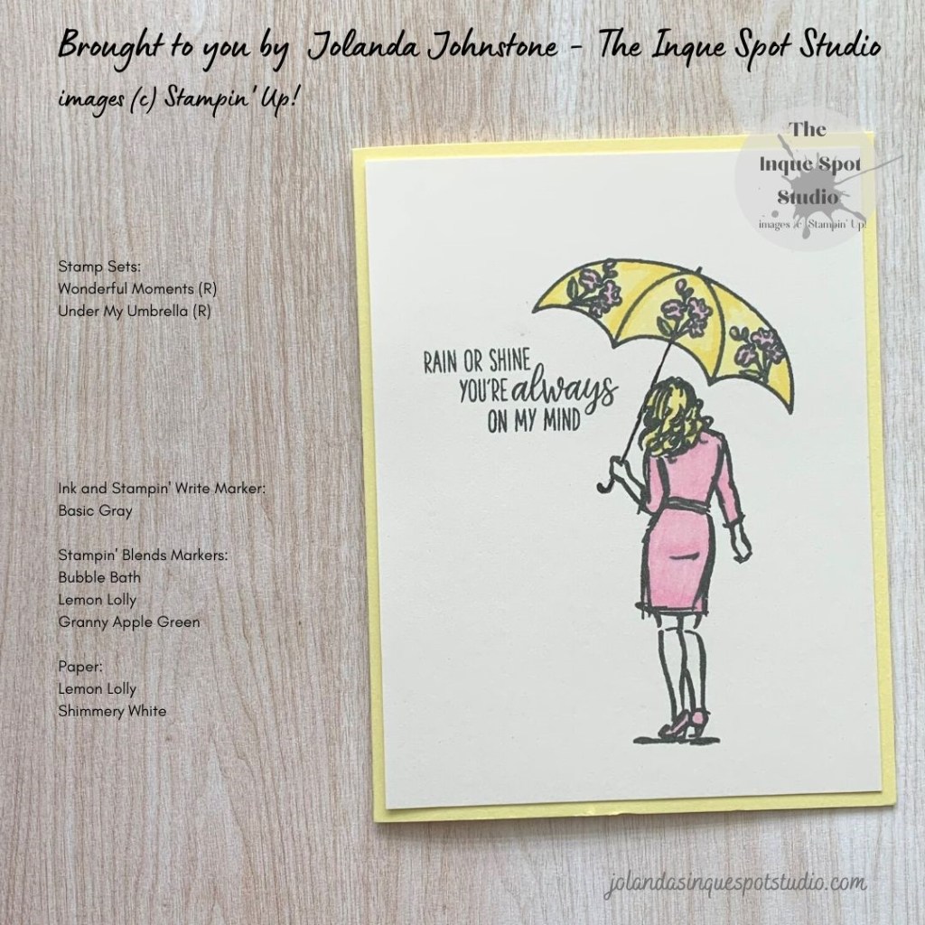 - The scene was colored with Stampin’ Blends Markers: Dress and Umbrella Flowers – Both Light and Dark Bubble Bath, Floral Leaves – Light Granny Apple Green and Umbrella and Hair – Both Light and Dark Lemon Lolly.