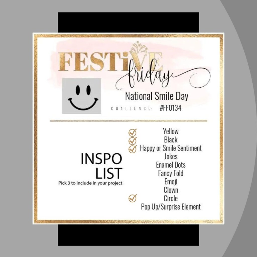 Starting with the CAS Colours & Sketches (#511) sketch and inspired by the circles. Adding Stripes for the CAS on Friday (#257) theme and picking up elements from the Festive Friday (#134) listing re: National Smile Day: Yellow, Black, Circles and Sentiment.