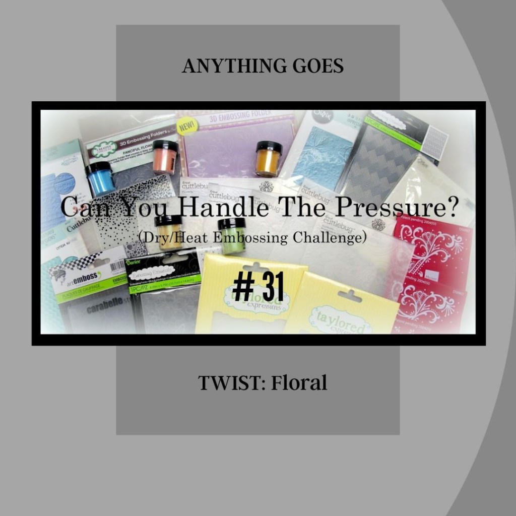 Less Is More (#483) Spring theme; Can You Handle the Pressure (#31) Floral Twist; Alphabet (Letter D) “D” for Dragonfly; Addicted to CAS (#238) Freedom theme; and bringing them all together the Tuesday Morning (#707) sketch.