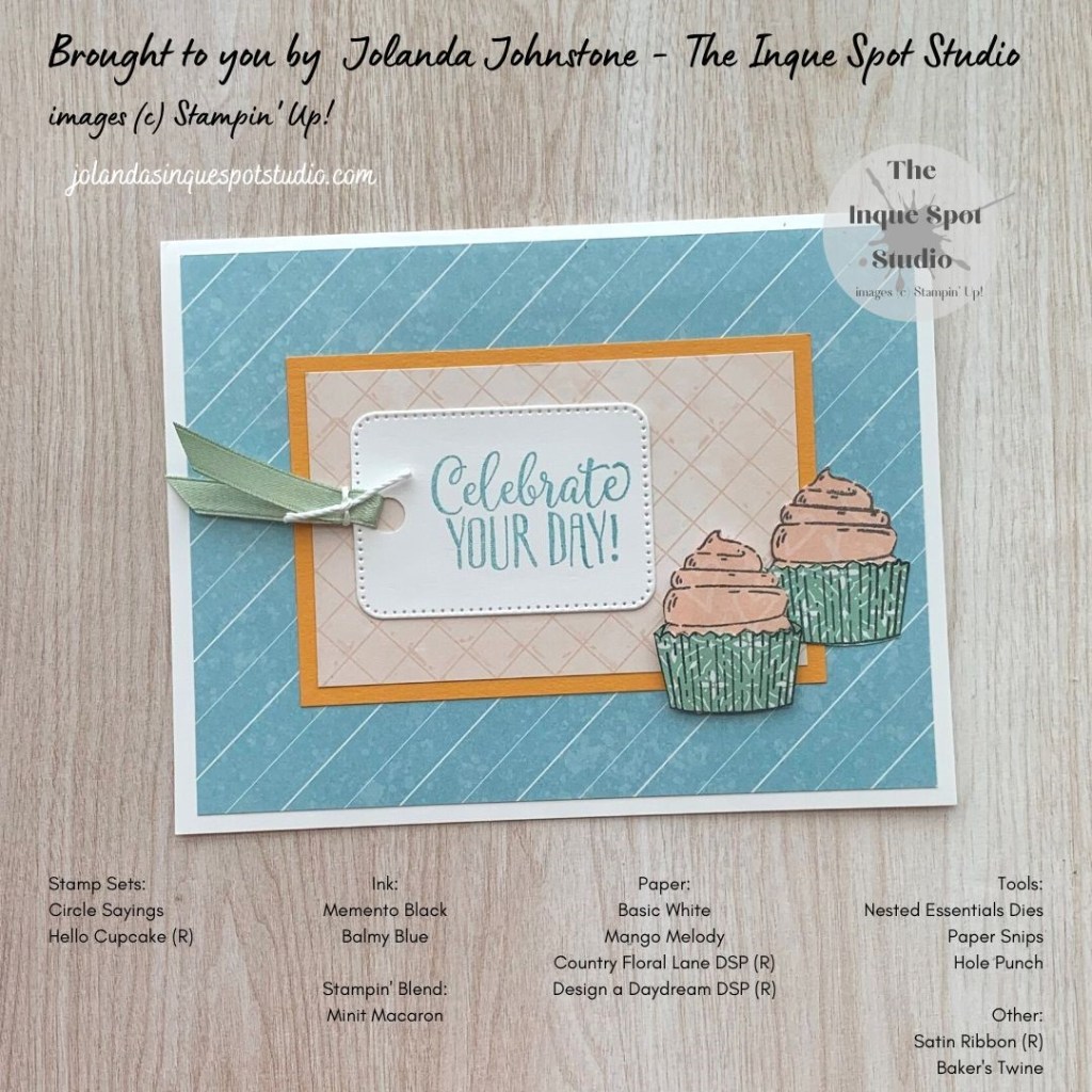 - The sentiment, Celebrate Your Day, from the retired Hello Cupcake stamp set was stamped with Balmy Blue ink.