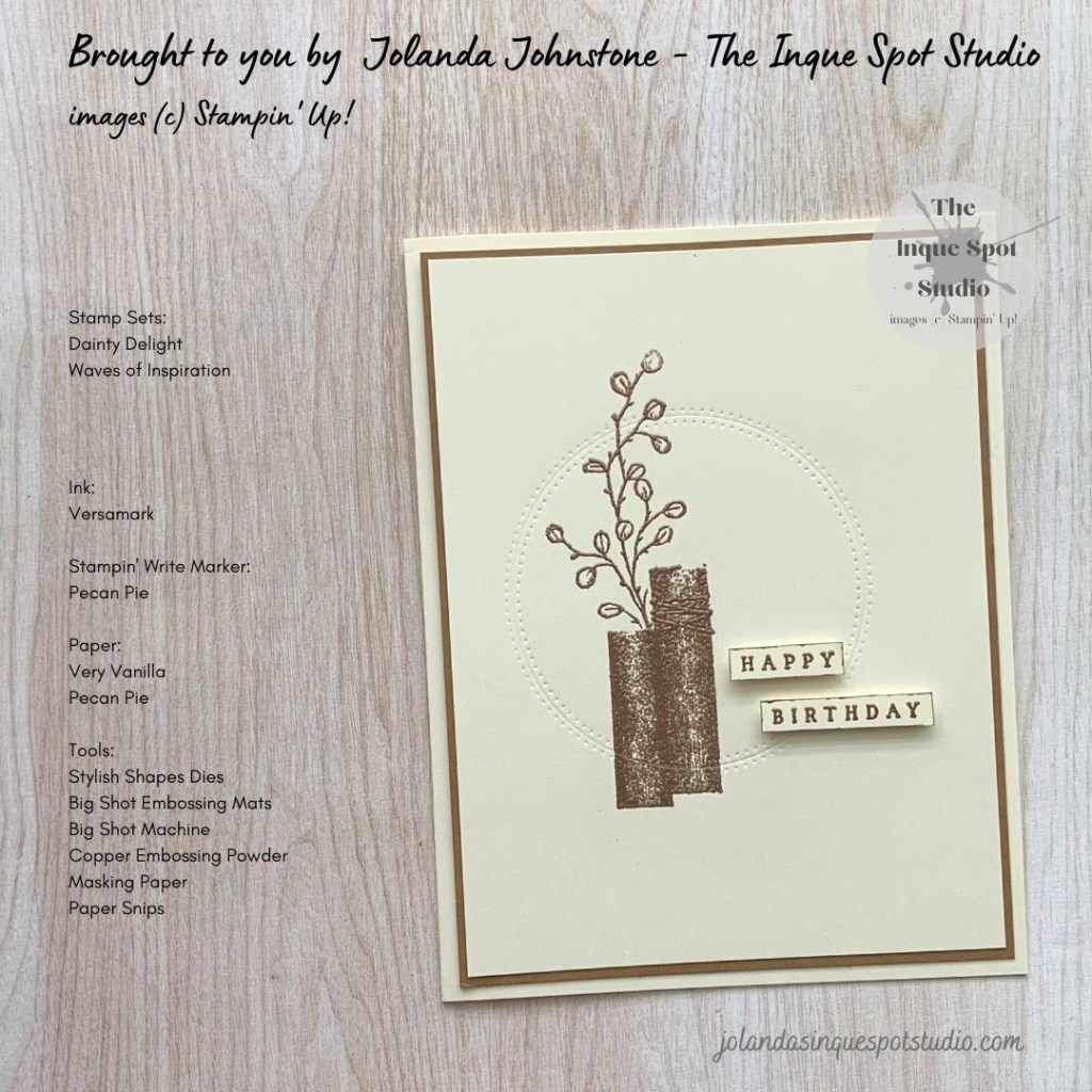 I created a Birthday card using the both the Waves of Inspiration and Dainty Delight stamp sets with Copper Embossing Powder and the Stylish Shapes Dies for Time Out (#239) picking up on the Copper elements and the Floral Vase for the CAS on Friday (#258) suggested embossing technique(s).