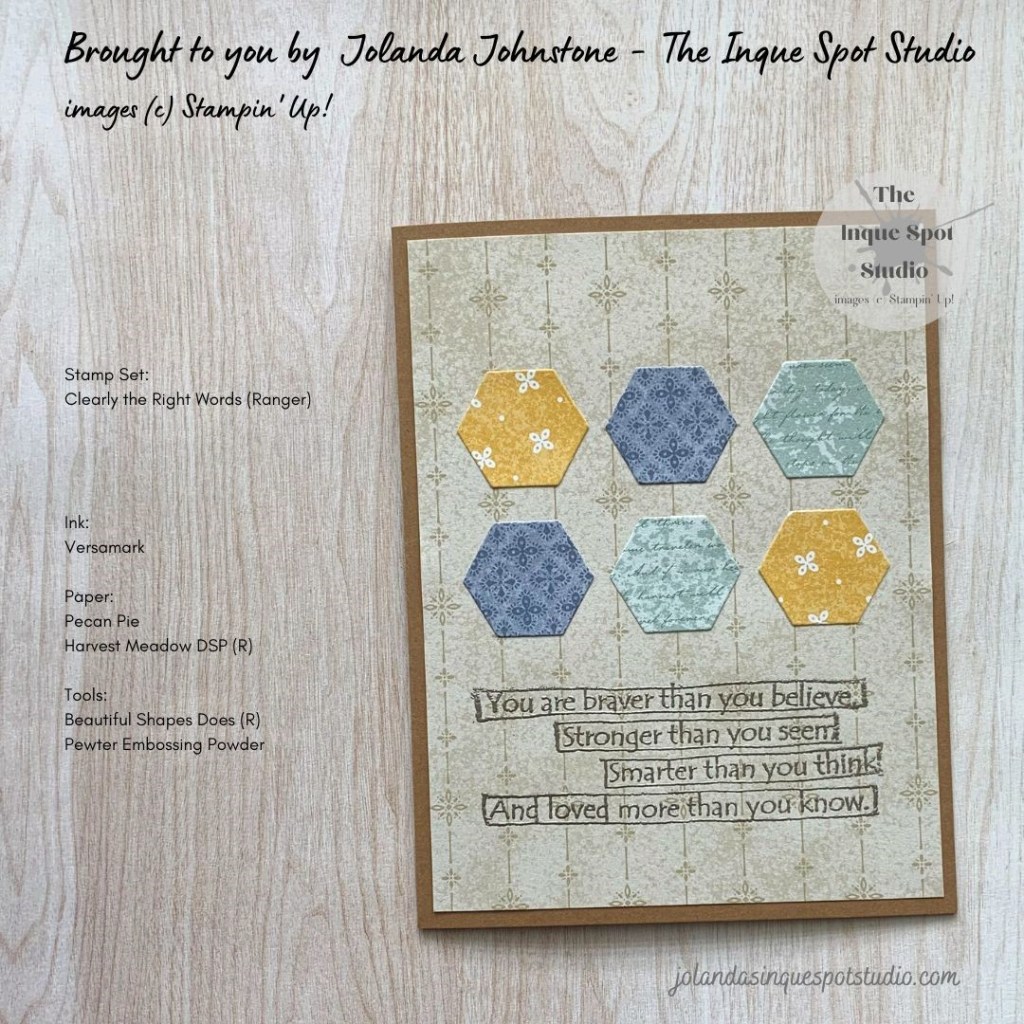 - Shapes – Hexagons: (1” x ⅞”) Bumblebee, Misty Moonlight and Soft Succulent scraps of patterned paper, also from the Harvest Meadows Designer Series Paper pack die-cut with the small Double Hexagon die from the retired Beautiful Shapes Dies set.
