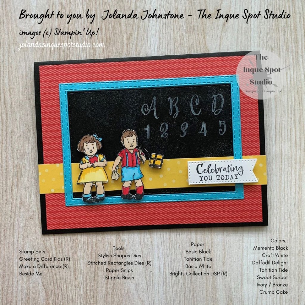 - The School Kids image from the retired Greeting Card Kids stamp set was stamped with Memento Tuxedo Black ink and colored with Stampin’ Blends Markers. Colors used: Light and Dark Daffodil Delight, Tahitian Tide and Sweet Sorbet. Additional colors: Skin – Ivory, Hair – Bronze and Bag – Light Crumb Cake.