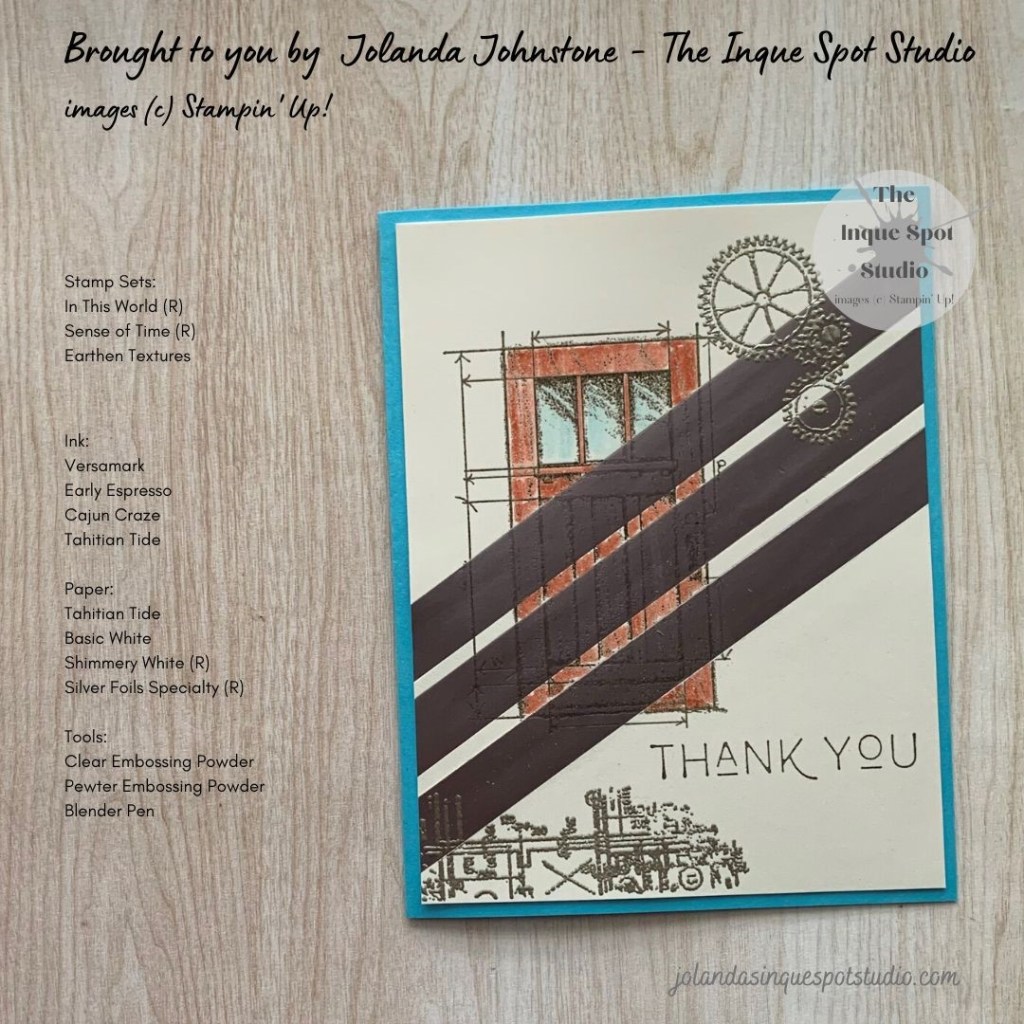 - Additionally, the Architectural Blueprint image, also from the In This World stamp set and the Industrial Cogs image from the retired Sense of Time stamp set were stamped with Versamark ink and heat-set with Pewter Embossing Powder.