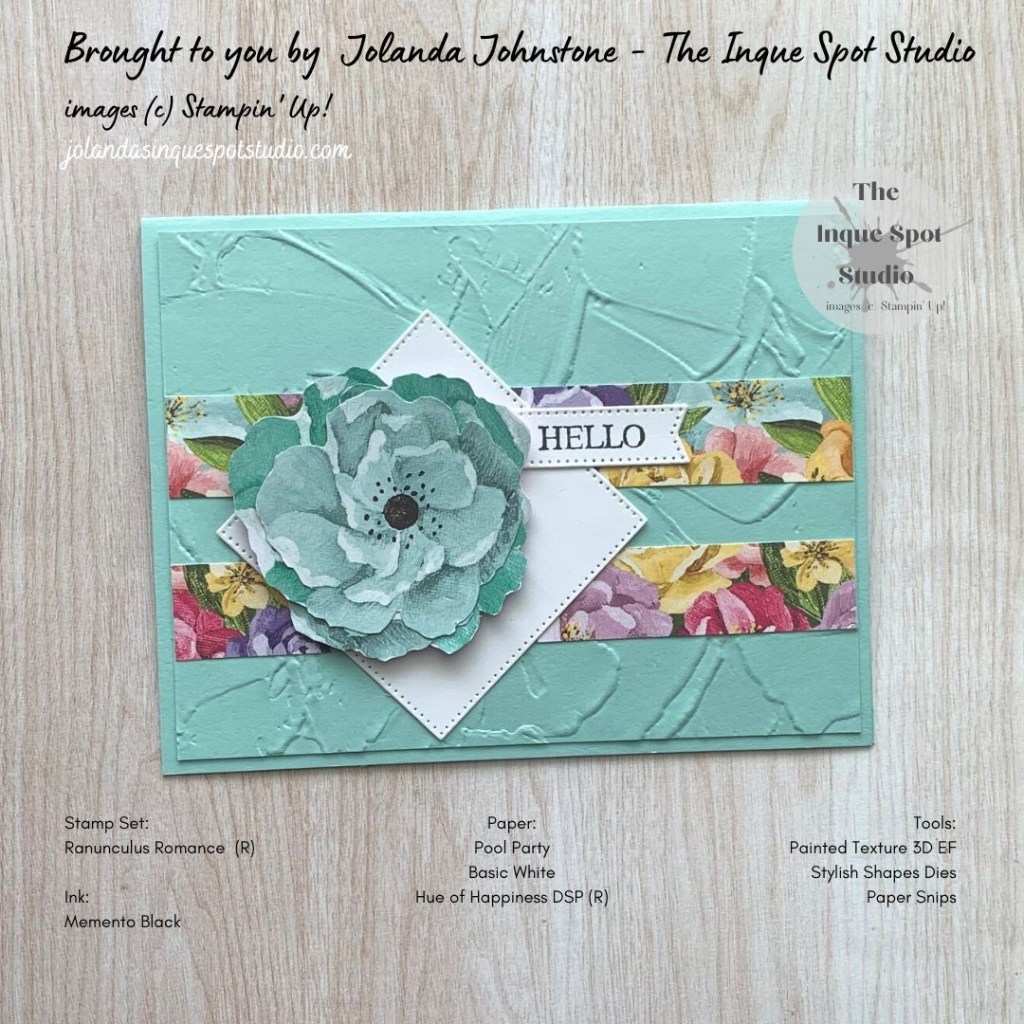 Jolanda, this is beautiful! I love the Pool Party and those gorgeous floral strips. The flower is so gorgeous, too! The beautiful embossing adds so much texture, too! You made my sketch shine at The Paper Players this week!