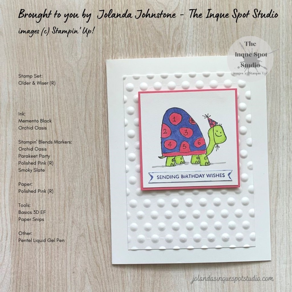 - The Turtle was colored with Stampin’ Blends Markers. Shell and Party Hat – Light Orchid Oasis and retired Dark Polished Pink, Shell Spots – Dark Polished Pink, Turtle – Light and Dark Parakeet Party, Toes and Grounding – Light Smoky Slate.