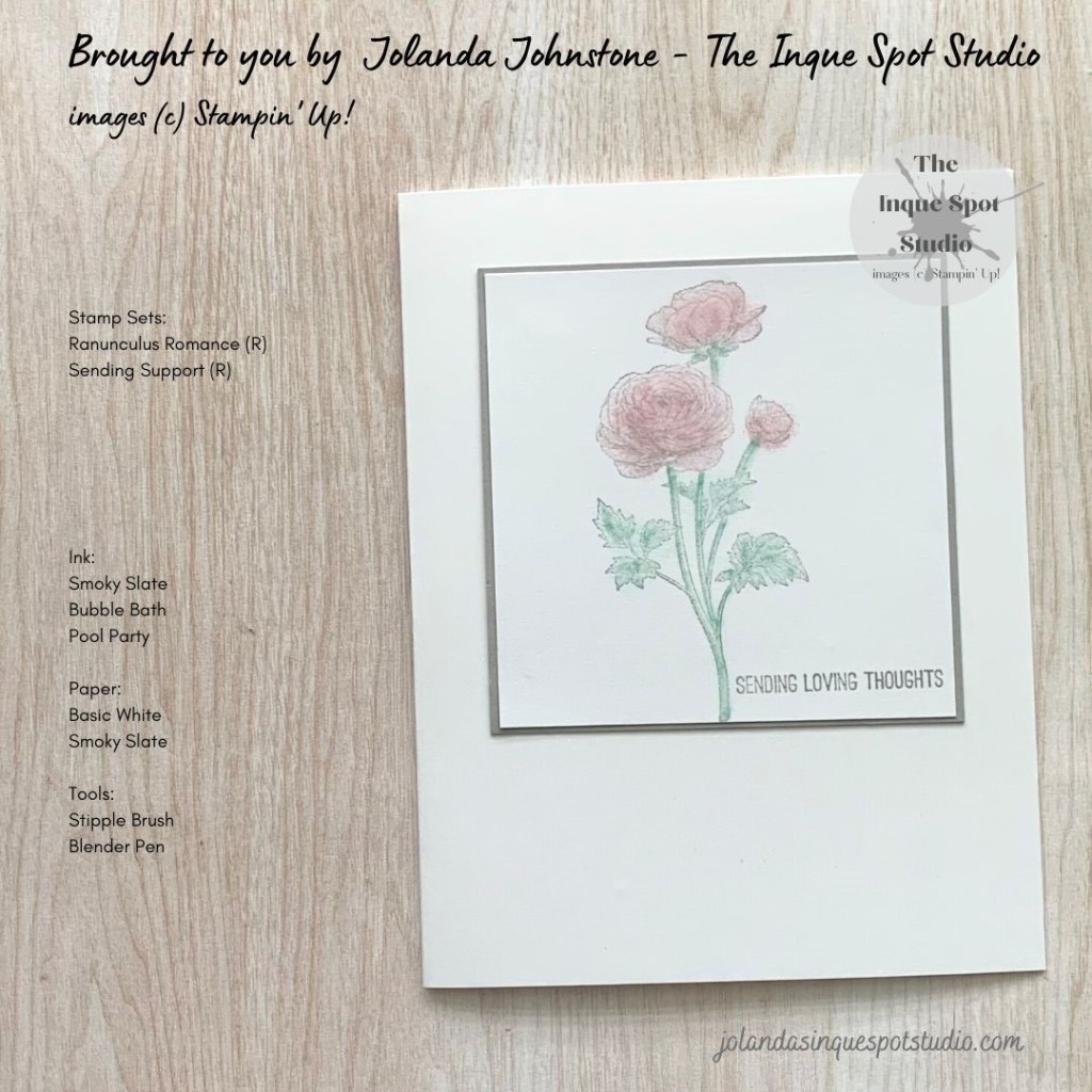 - The Ranunculus Flower image from the retired Ranunculus Romance stamp set was stamped with Smoky Slate ink as was the truncated sentiment, Sending Loving Thoughts, from the retired Sending Support stamp set.