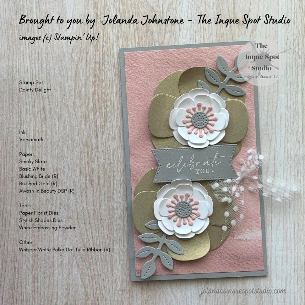 - Flowers and Leaves: Brushed Gold (retired), Blushing Bride (retired), Basic White and Smoky Slate cardstock scraps from my bin.