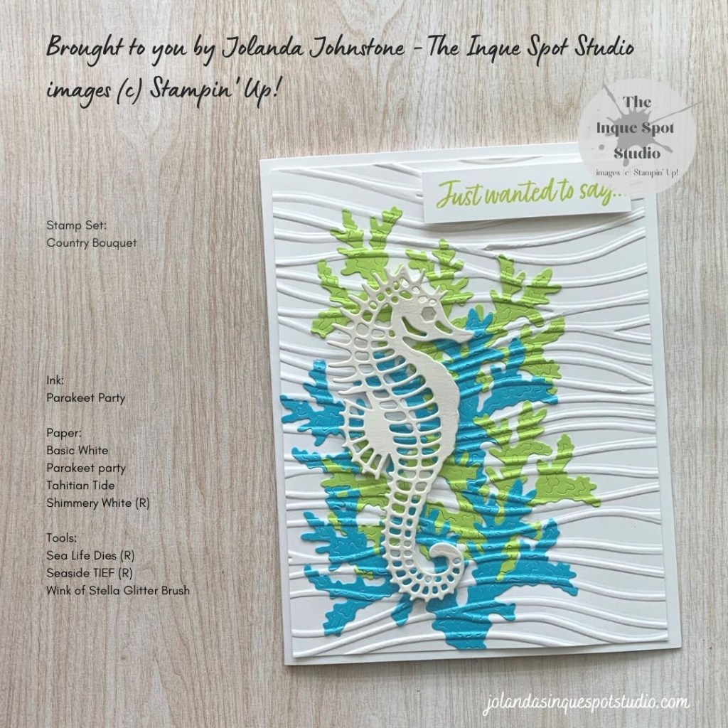 All elements were adhered to the card base. The Sea Horse and the Sentiment were popped up with Dimensionals.