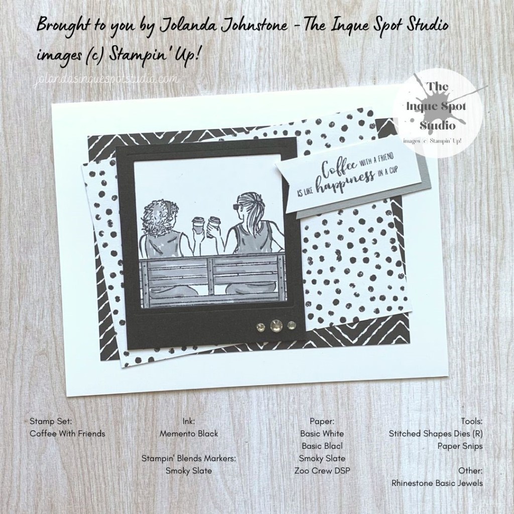 - The sentiment, Coffee with a friend…, was stamped with Memento Tuxedo Black ink. Both Flags were lined up together and the “Flag Cut” was nipped in by hand with Paper Snips.