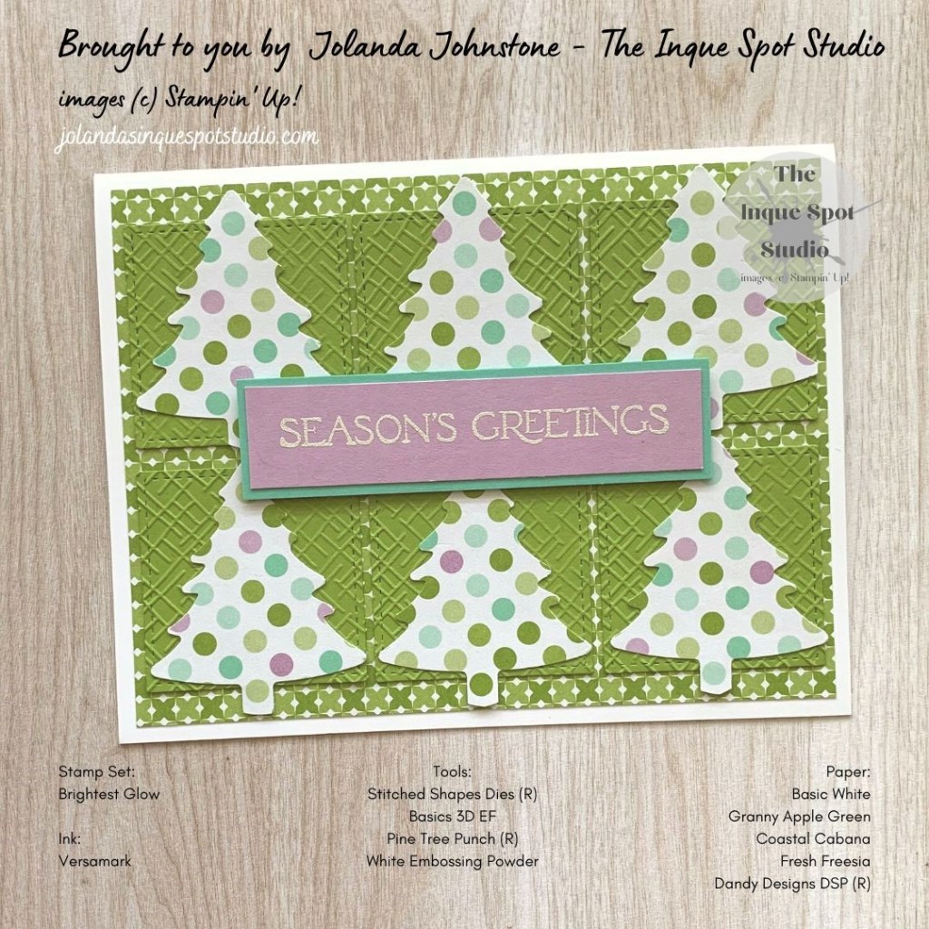- The sentiment, Season’s Greetings, from the Brightest Glow stamp set was stamped with Versamark ink and heat-set with White Embossing Powder.