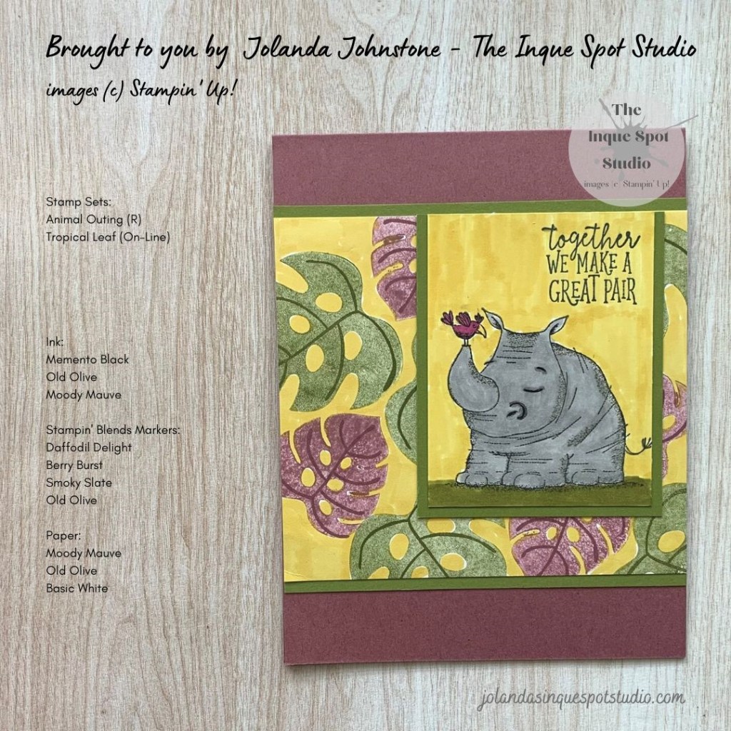All elements were adhered to the card base to resemble the sketch. Old Olive and Moody Mauve give the scene a lush feeling while the Daffodil Delight adds the heat. Our colorful bird and friendly Rhino are happy to hang out with each other.