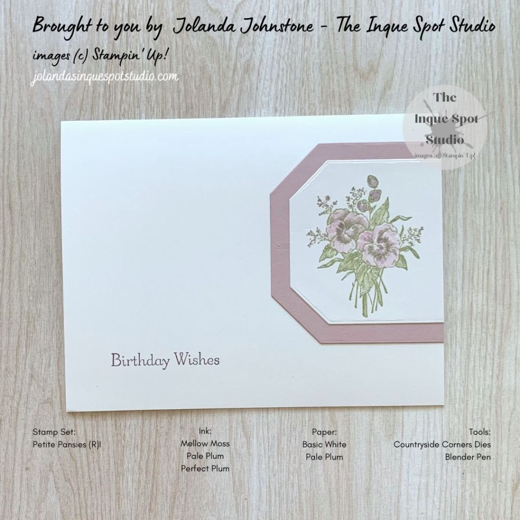 - The sentiment, Birthday Wishes, from the pretty retired Petite Pansies stamp set was stamped with Perfect Plum ink.