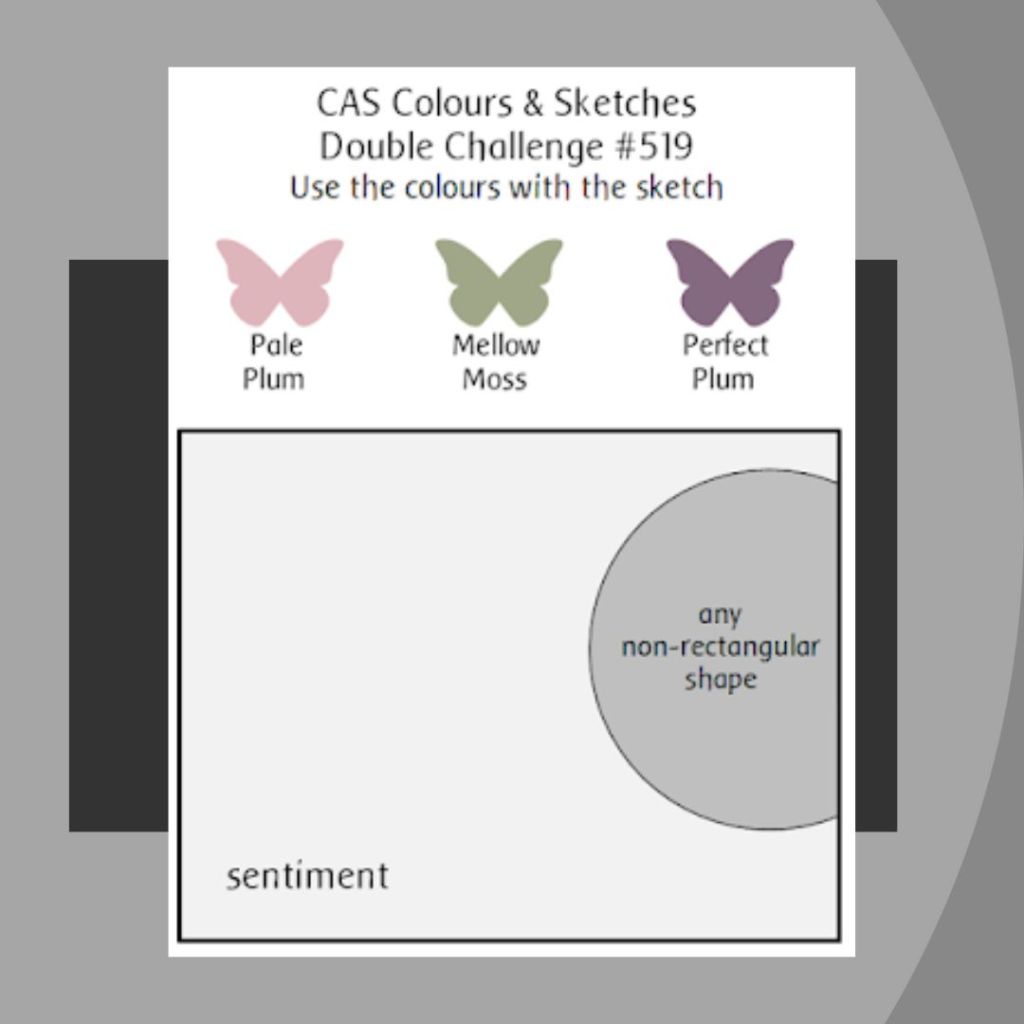 A favorite challenge of mine is CAS Colours & Sketches. If a month has a fifth week, the team throws out a retro sketch and selects some lovely retired colors. This time it is Mellow Moss, Pale Plum and Perfect Plum. It is always fun to root around for the Ink Pads and/or cardstock scraps in my stash bins.