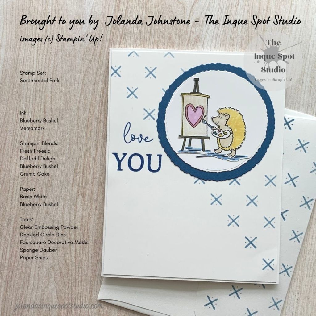 • The sentiments, love and YOU, from the Sentimental Park stamp set were stamped into Versamark ink and then into Blueberry Bushel ink and stamped.  The words were heat-set with Clear Embossing Powder using the Clear Color Embossing Technique.