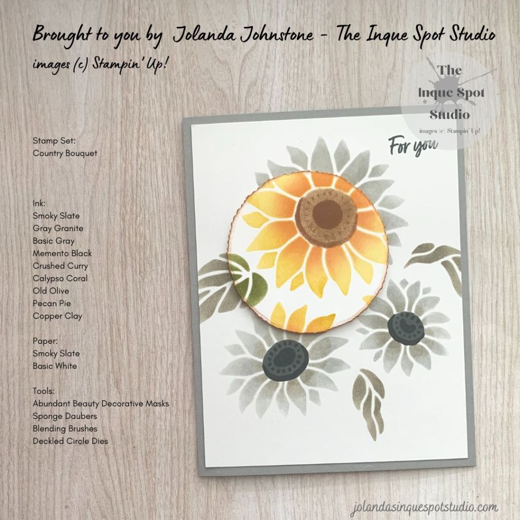 - Spot Light: (4” x 5¼”) Basic White cardstock. The Stencils were used again to create the colored Sunflower using either a Blending Brush or a Sponge Dauber depending on the current color ink when last used.