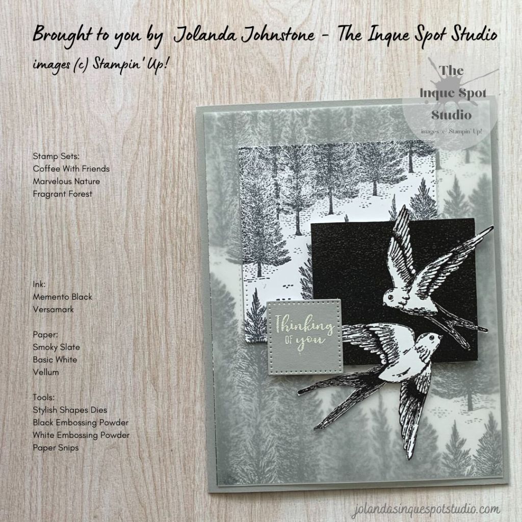 - The sentiment, Thinking of You, from the Coffee With Friends stamp set was also stamped with Versamark ink but heat-set with White Embossing Powder.