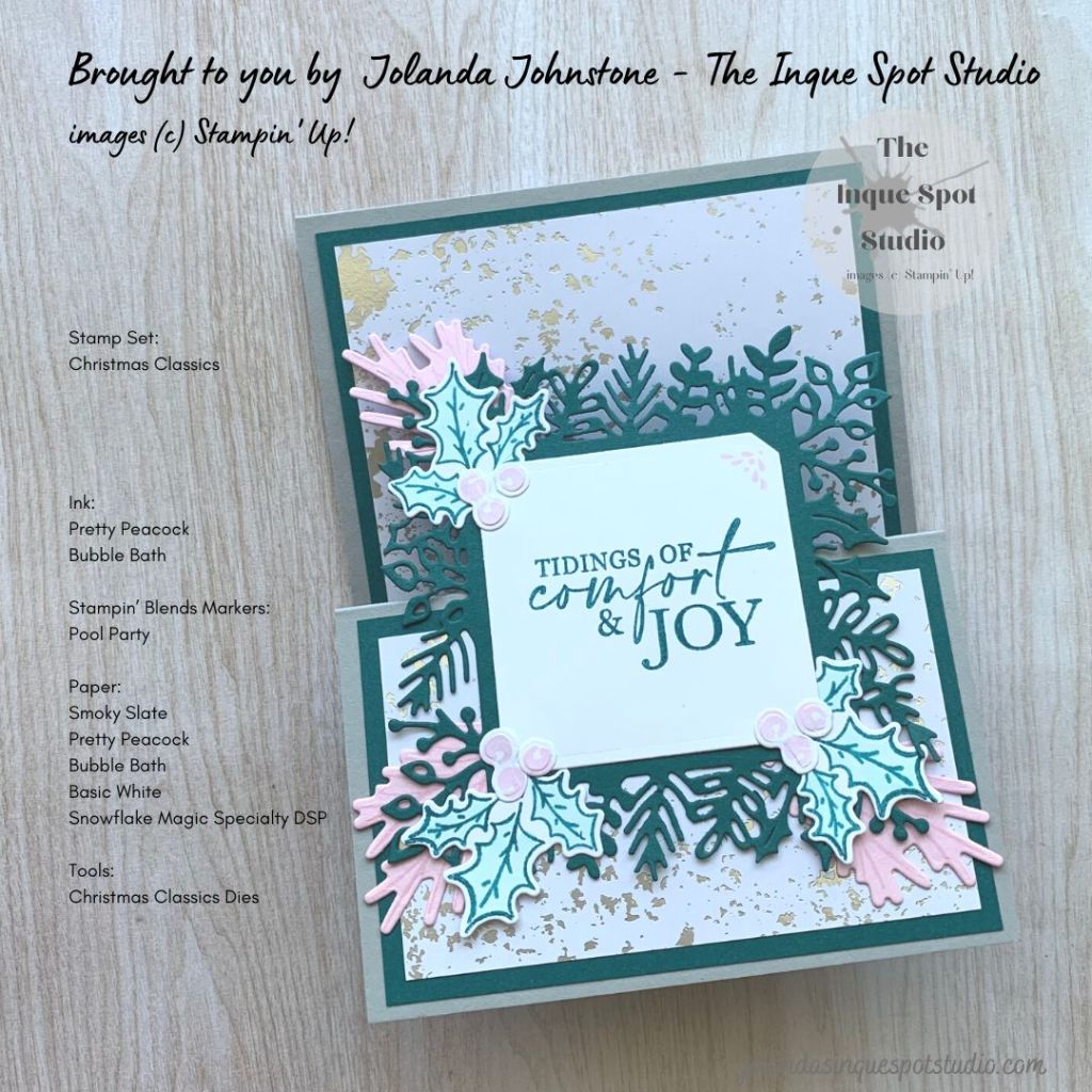 - From the Christmas Classics stamp set, the greeting, Tidings of Comfort & Joy, was stamped with Pretty Peacock ink and the little Flourish was stamped with Bubble Bath ink (for Ballerina).