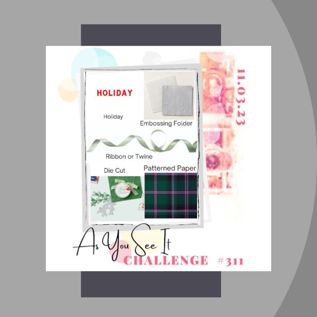 2. Embossing DSP really makes a difference, doesn’t it. I like the way you’ve incorporated all the ingredients of our recipe into a super Christmas card and I like the summery colours you’ve used. Thanks for playing along with us again at As You See It – it’s always a pleasure to have you join us. 🙂