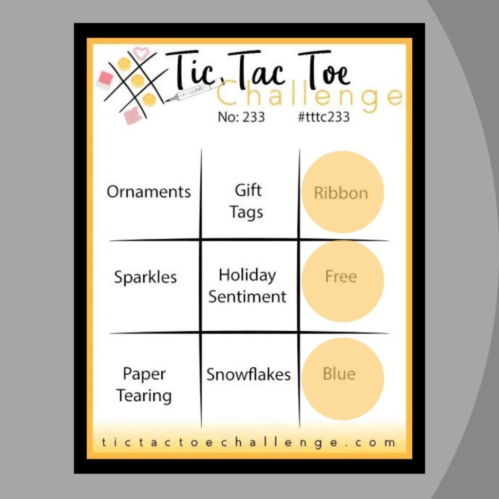 Back to the Christmas cards.  Today I am playing with these challenges: As You See It (#311) for their Holiday Recipe of ingredients; Tic Tac Toe (#233) for a line of the board; the colors suggested by Facebook Colour INKSspiration (#154); and bringing it all together with the Global Design Project (#418) sketch.  Let’s play!