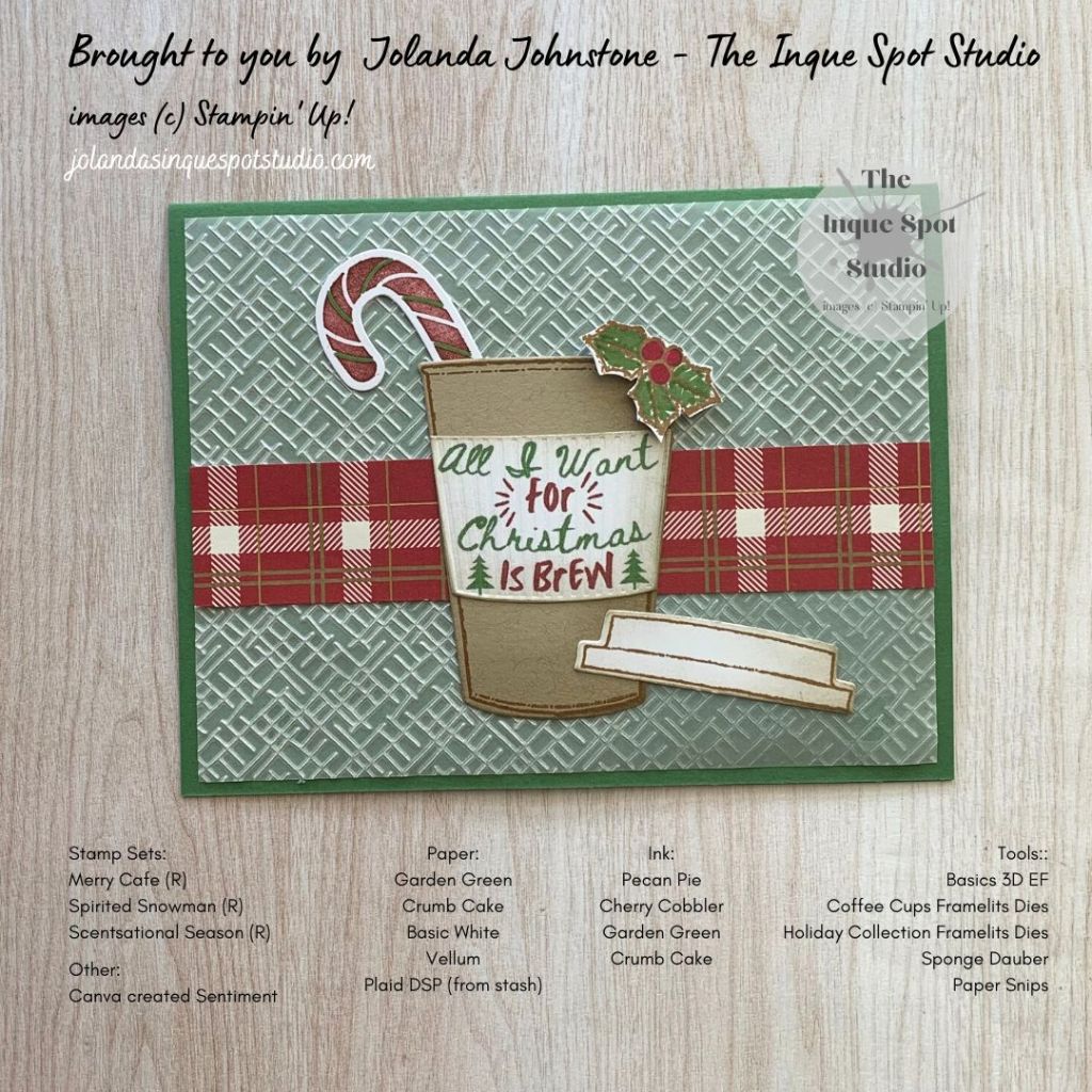 - The sentiment, All I Want for Christmas is Brew, was created in Canva and sized to fit the Sleeve embossing die also from the Coffee Cups Framelits Dies set.