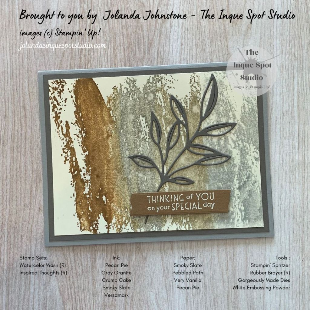 - The sentiment, Thinking of You on your Special day, from the retired Inspired Thoughts stamp set was stamped with Versamark ink and heat-set with White Embossing Powder.