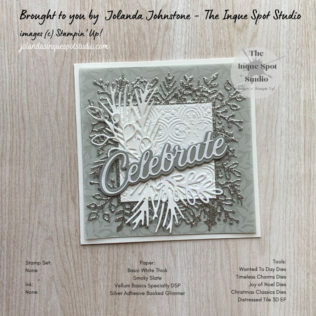 - Square Wreath: (4” x 4”) Silver Adhesive Backed Glimmer paper die-cut with the Holly Leaf Frame die from the Christmas Classics Dies set.